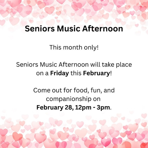 The Seniors Lunch and Music Afternoon will not take place in March. We look forward to seeing you at the next one in April.