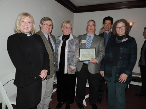 Church of the Ascension accepted a Heritage Award from the Architectural Conservancy of Ontario (London branch) and the Heritage London Foundation on Feb. 20, 2014: “We are presenting this award to you for the creation of a new church in which you have incorporated cherished and historic items, including stained glass windows, from the four constituent churches. Your project provides a new spiritual home in an imaginative adaptation and reuse of a former commercial building.” Representing Ascension at the gala were Rev. Canon June Hough, left, Roger Chapman of Sunrise Stained Glass Windows, parishioners Mary Grant and Philip Templeton, Richard Hammond of Cornerstone Architecture, and Sylvia Chodas of the Architectural Conservancy of Ontario.